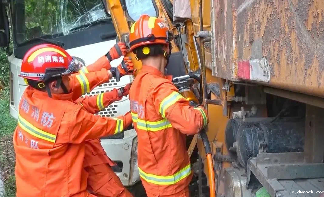 接到报警后,大队立即派员赶赴现场进行救援。消防指战员到场观察后发现:两辆货车车头对撞,驾驶室严重变形,其中一名货车司机双腿被变形的驾驶室夹住,无法脱身。