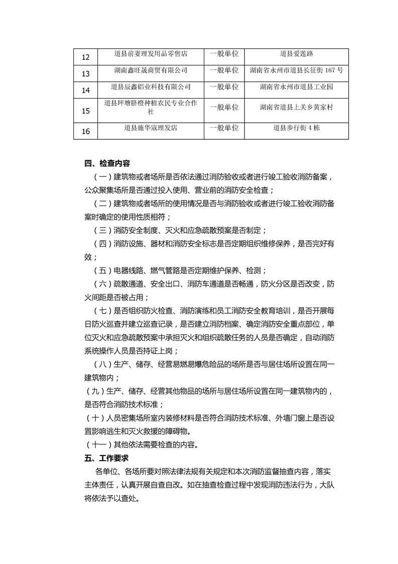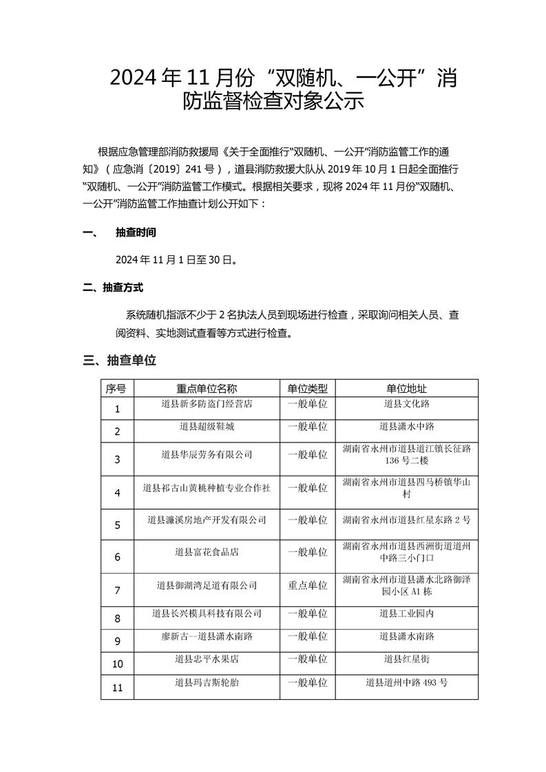2024年11月份“双随机、一公开”消防监督检查对象公示