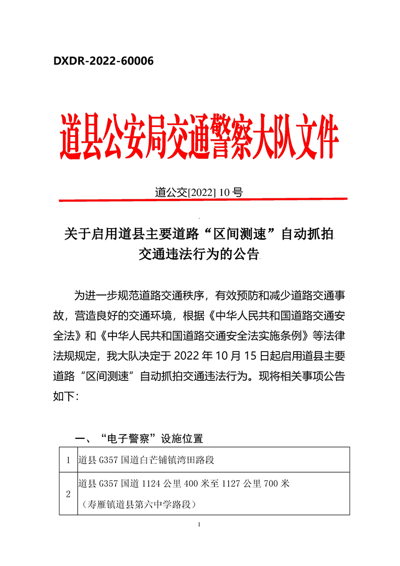 关于启用道县主要道路“区间测速”自动抓拍交通违法行为的公告