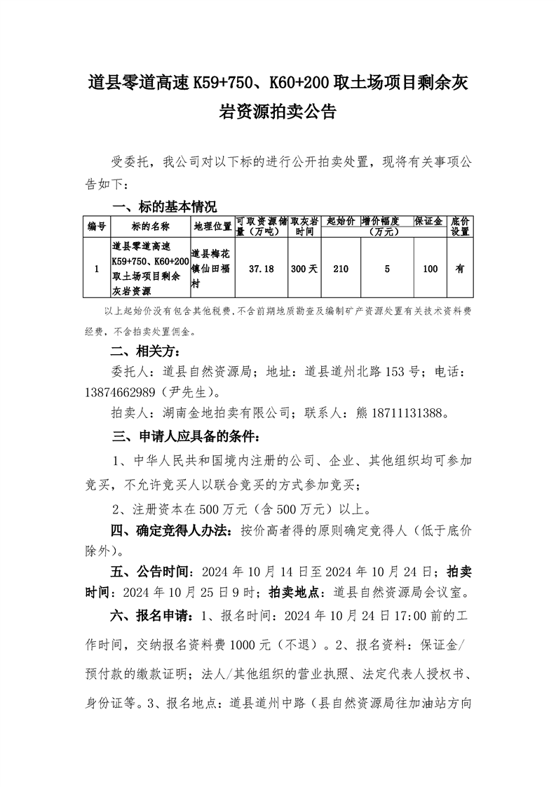 道县零道高速K59+750、K60+200取土场项目剩余灰岩资源拍卖公告