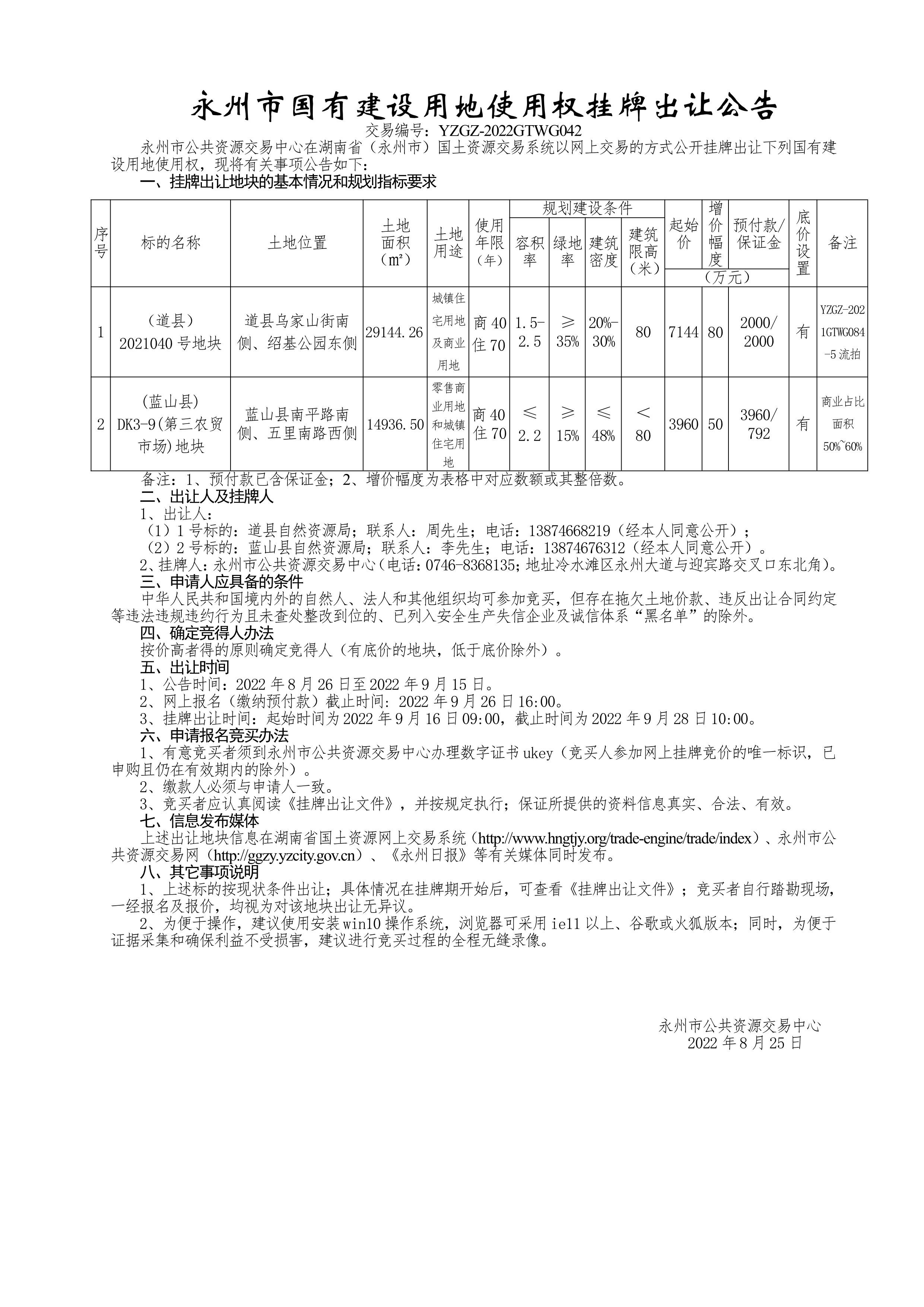 永州市国有建设用地使用权挂牌出让公告 YZGZ-2022GTWG042