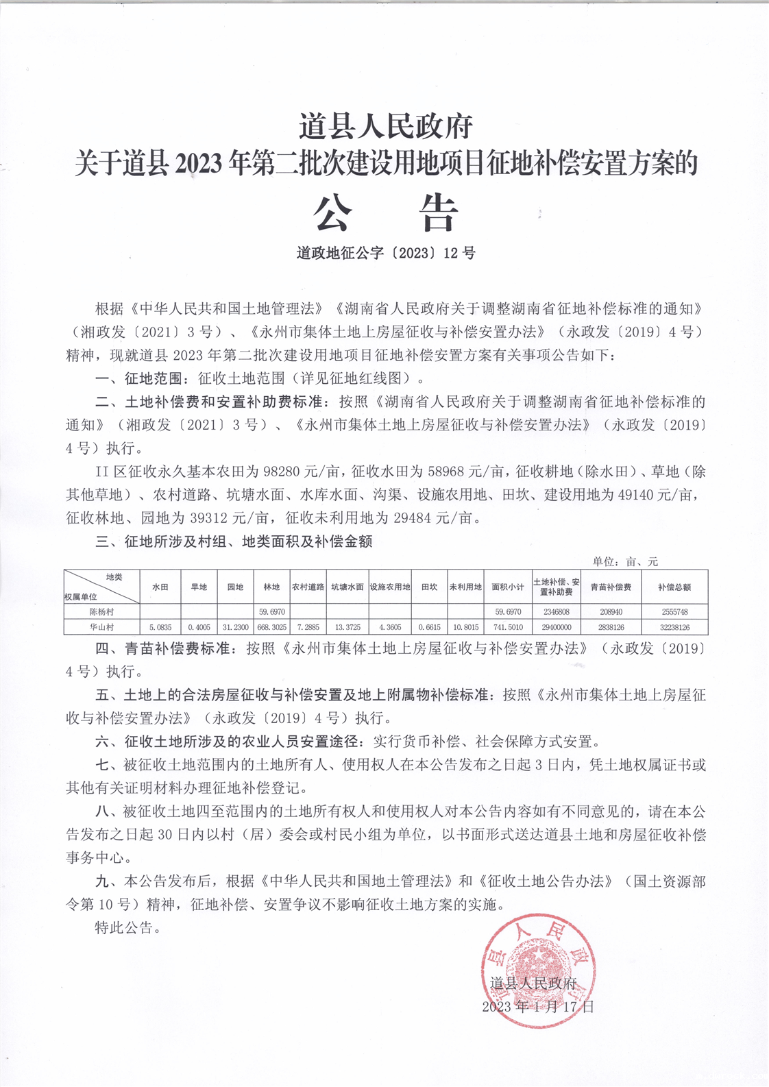 道县2023年第二批次建设用地项目征地补偿安置公告