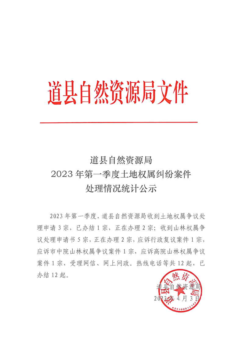 道县自然资源局2023 年第一季度土地权属纠纷案件处理情况统计公示