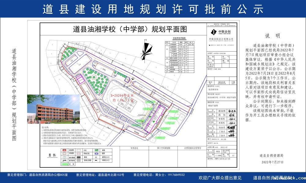 道县油湘学校(中学部)规划平面图已经我局2022年7月7日规划项目审查小组会议集体审议。根据《中华人民共和国城乡规划法》之规定,该建设方案须予以公示,公示期为2022年7月28日至2022年8月5日,公示期为7个工作日。公示期内,该地段相关利害关系人若对该项目有意见和建议,可以书面形式向我局信访室反映,并有权申请听证。