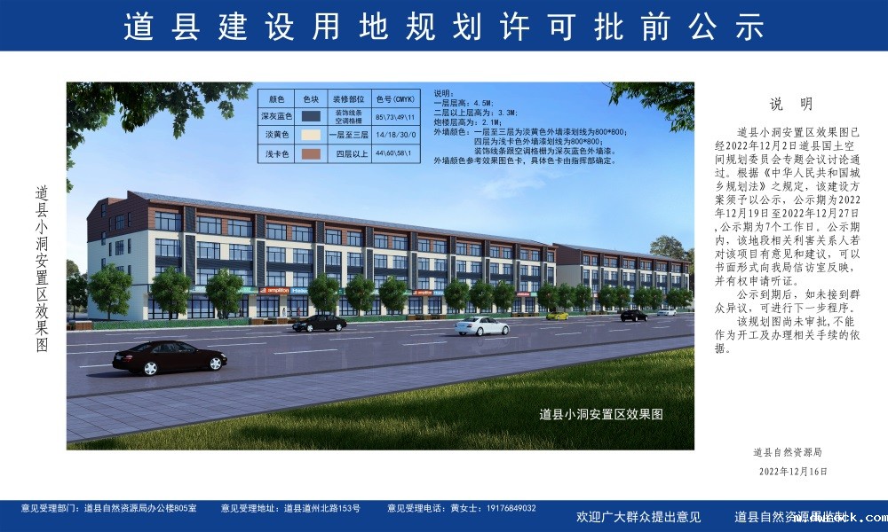 道县小洞安置区效果图已经2022年12月2日道县国土空间规划委员会专题会议讨论通过。根据《中华人民共和国城乡规划法》之规定,该建设方案须予以公示,公示期为2022年12月19日至2022年12月27日,公示期为7个工作日。公示期内,该地段相关利害关系人若对该项目有意见和建议,可以书面形式向我局信访室反映,并有权申请听证。