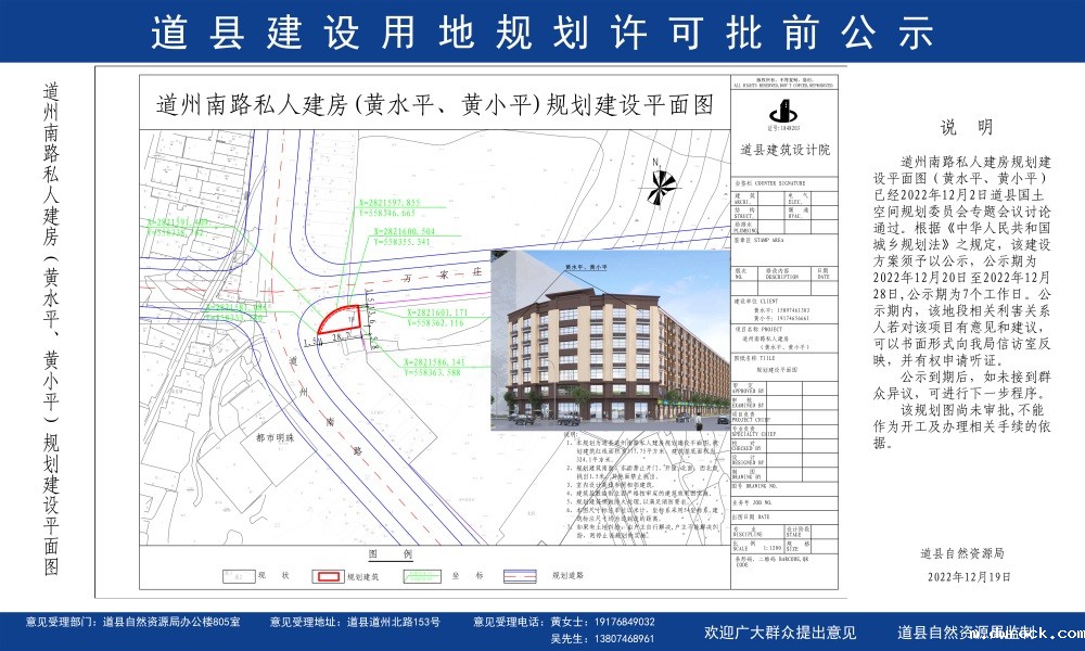 道州南路私人建房规划建设平面图(黄水平、黄小平)已经2022年12月2日道县国土空间规划委员会专题会议讨论通过。根据《中华人民共和国城乡规划法》之规定,该建设方案须予以公示,公示期为2022年12月20日至2022年12月28日,公示期为7个工作日。公示期内,该地段相关利害关系人若对该项目有意见和建议,可以书面形式向我局信访室反映,并有权申请听证。