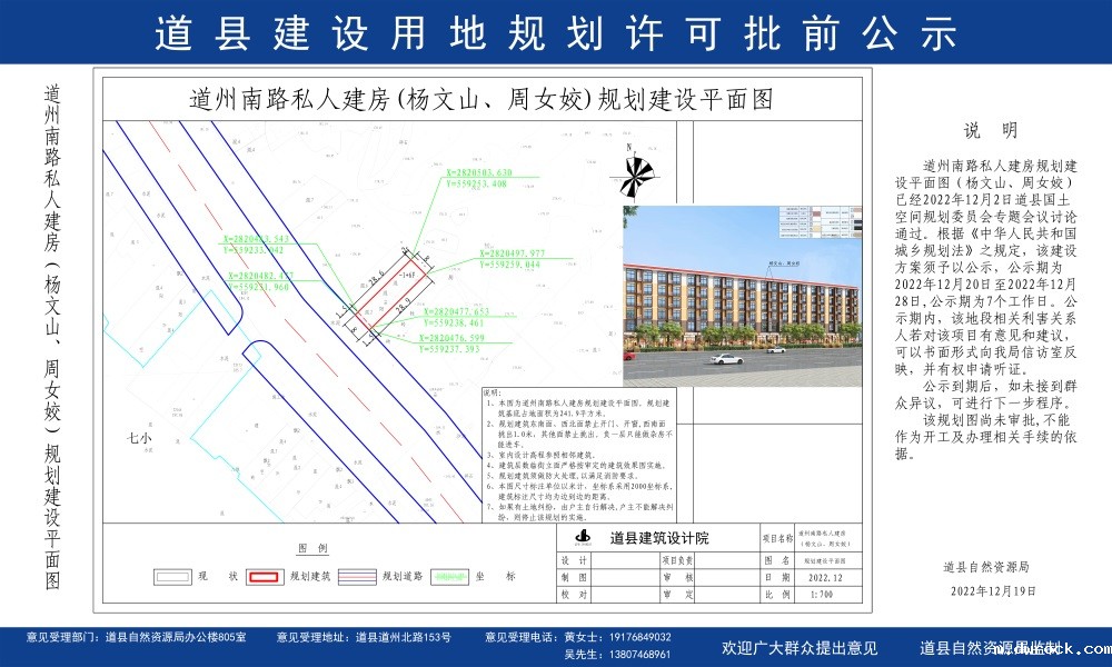 道州南路私人建房规划建设平面图(杨文山、周女姣)已经2022年12月2日道县国土空间规划委员会专题会议讨论通过。根据《中华人民共和国城乡规划法》之规定,该建设方案须予以公示,公示期为2022年12月20日至2022年12月28日,公示期为7个工作日。公示期内,该地段相关利害关系人若对该项目有意见和建议,可以书面形式向我局信访室反映,并有权申请听证。