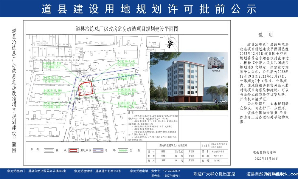道县冶炼总厂房改房危房改造项目规划建设平面图已经2022年12月2日道县国土空间规划委员会专题会议讨论通过。根据《中华人民共和国城乡规划法》之规定,该建设方案须予以公示,公示期为2022年12月19日至2022年12月27日,公示期为7个工作日。公示期内,该地段相关利害关系人若对该项目有意见和建议,可以书面形式向我局信访室反映,并有权申请听证。。