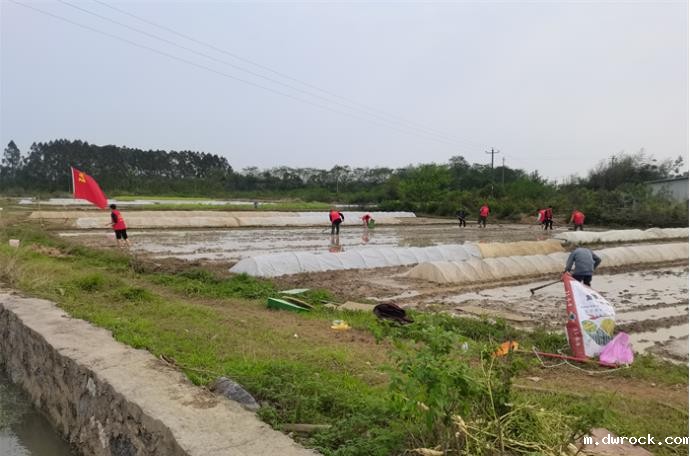 田间, 一名名党员拿着锄头、铁锨、耙子下田帮助农户整理水稻秧田,疏通排水沟保障春耕生产用水。个个亲力亲为,履行党员义务,为防止“非农化非粮化”、助力乡村振兴增添一道风景线。